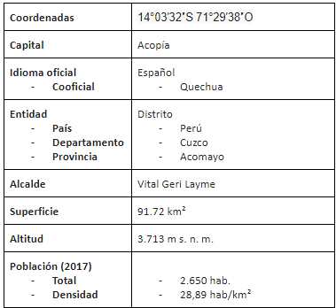 El Distrito peruano de Acopía es uno de los 7 distritos de la Provincia de Acomayo, ubicada en el Departamento de Cusco, bajo la administración el Gobierno regional del Cuzco.